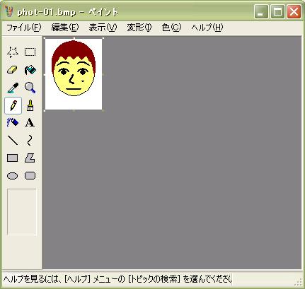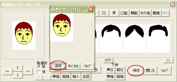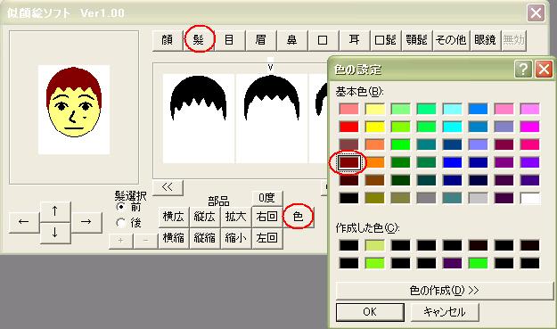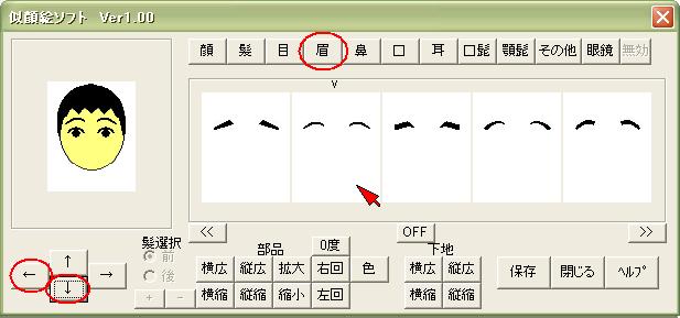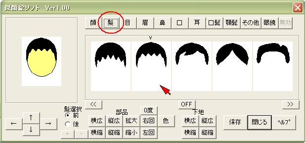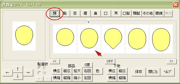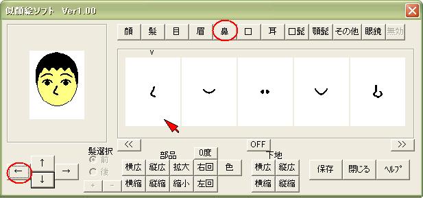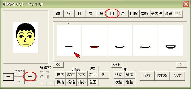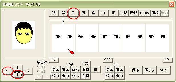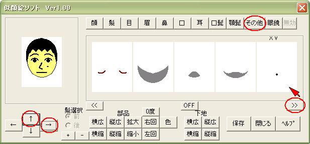 顔・髪・目・眉・鼻・口・耳・髭・眼鏡・その他のボタンを押しと、 各顔のパーツが5個づつ表示します。 5個以上の場合は「>>」や「<<」で表示切替えします。 マウスでパーツをクリックすると選択出来ます。 選んだパーツは矢印ボタンで移動します。 又。拡大縮小・回転・色なども自由に出来ます。 角度は5度づつで最大40度までです。 髪は前髪と後髪で操作を切り替えできます。 パーツのその他は、複数選べます。(最大10個) 色も変更可能です。 一連の操作を下記のように表します。 |