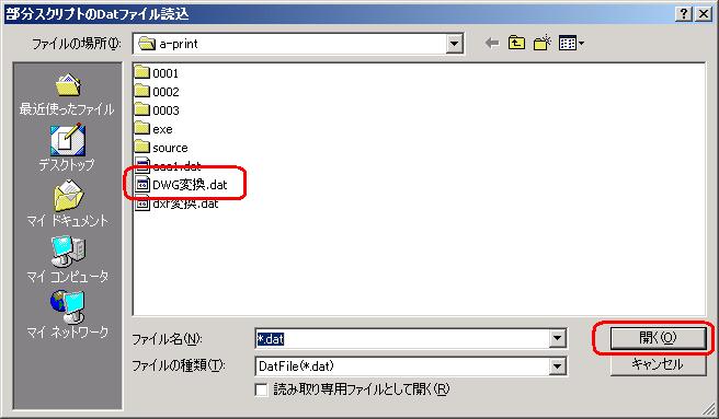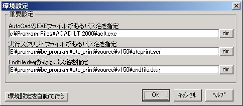 | <重要設定> 以下の項目を正しく設定しないと動作しません。 1・AutoCADのEXEファイルのパス名 AutoCADのアプリケーションのパス名を指定します。 これを正しく設定してなければ、印刷時にスクリプトファイル作成後、自動でAutoCADが立ち上がりますが、 立ち上がらずに、印刷できません。 必ず設定して下さい。 設定方法は「dir」のボタンをおしてそのファイル名をクリックして下さい。 2・実行スクリプトファイルのパス名 印刷時にスクリプトファイルを作成するパス名を指定します。 これを正しく設定してなければ、印刷時にスクリプトファイルが作れずに、印刷が出来なくなります。 必ず設定して下さい。 設定方法は「dir」のボタンをおしてそのファイル名をクリックして下さい。 3・ファイル「Endfile.dwg」が存在するパス名 印刷終了時にautoCADを自動終了するために設定します。 これを正しく設定してなければ、autoCADが起動したままで、終了(閉じる)しません。 必ず設定して下さい。 設定方法は「dir」のボタンをおしてそのファイル名をクリックして下さい。 4・環境設定を自動で行う このボタンを押すと、AutoCADのEXEファイルと実行スクリプトファイルと「Endfile.dwg」ファイルを検索し 自動で設定する方法です。 このボタンを押すとHDDの中を全てスキャンするので10〜25分ぐらいかかります。 急いで設定するなら「dir」で行って下さい。 5・環境設定の内容は「aprt_set.ini」に保存します(アプリ終了時) |