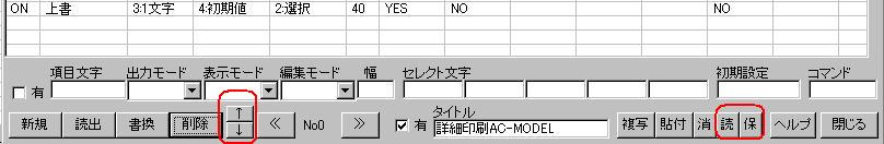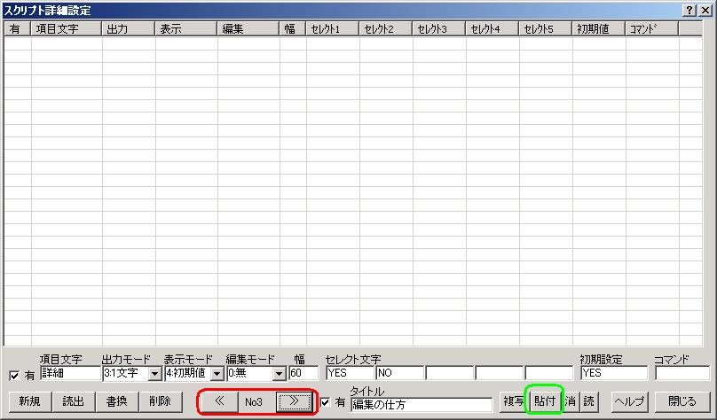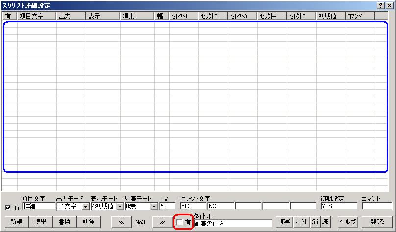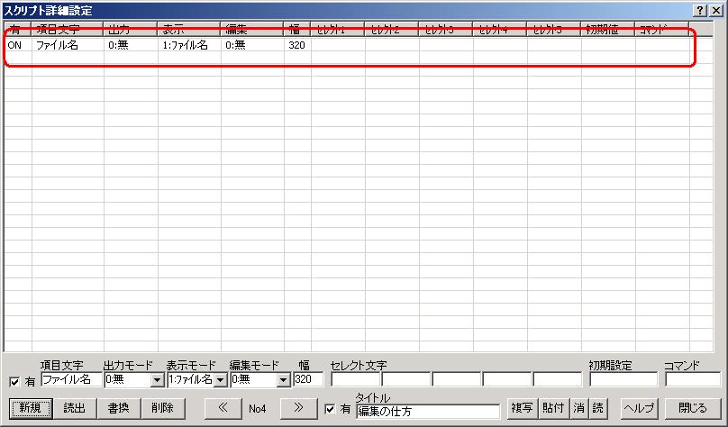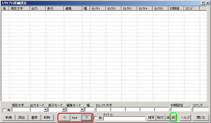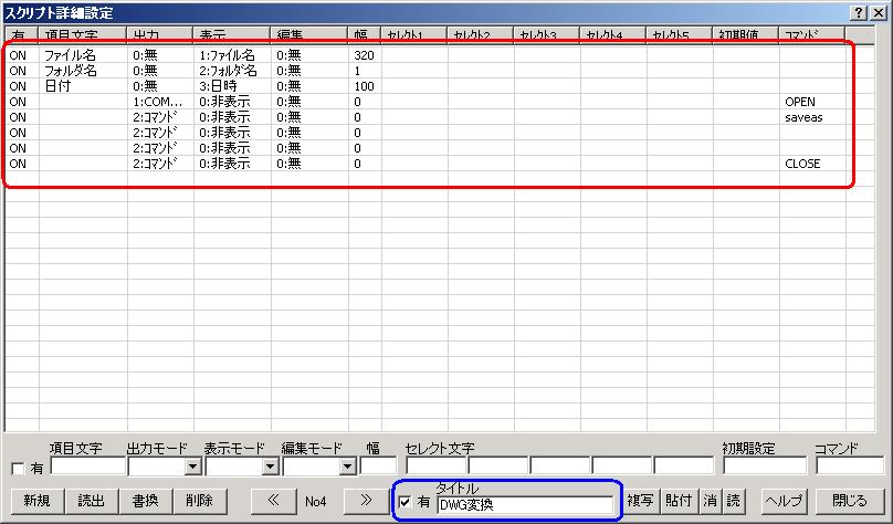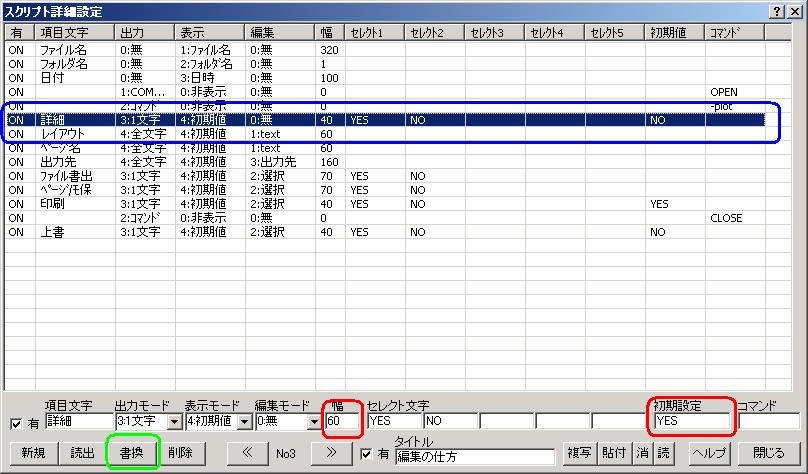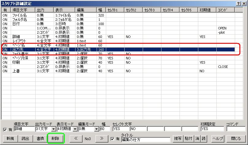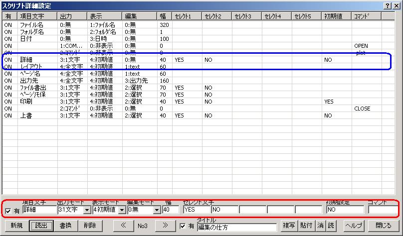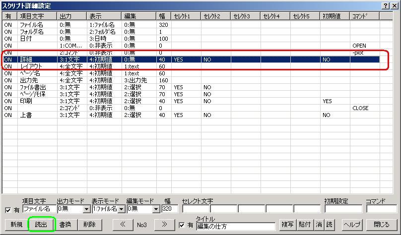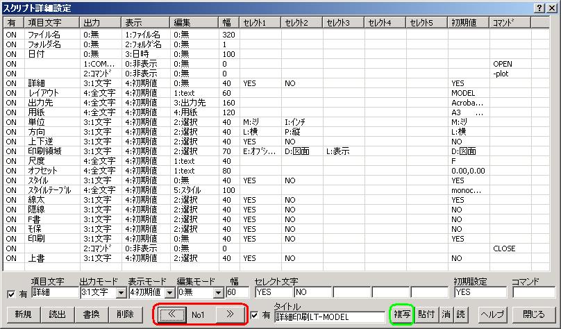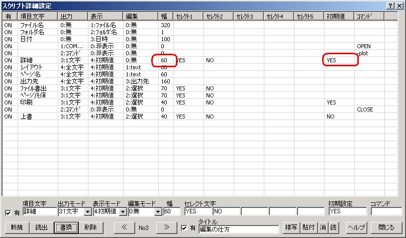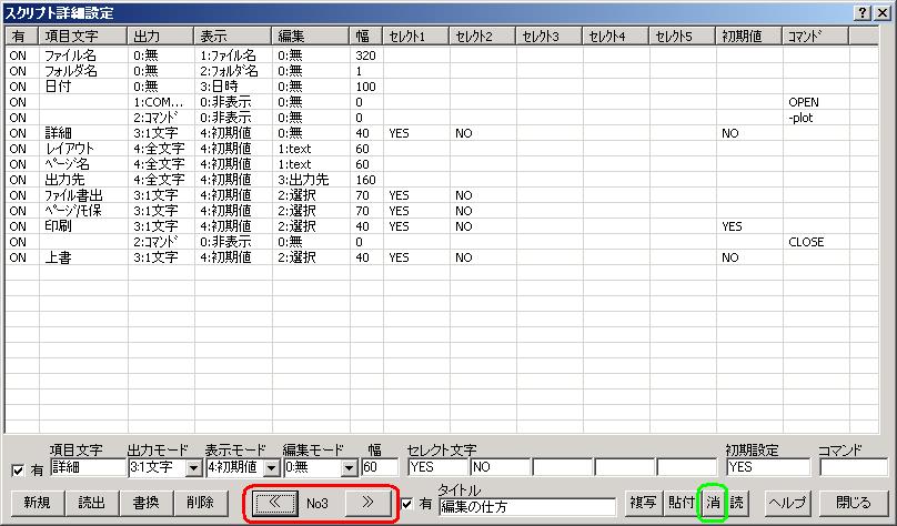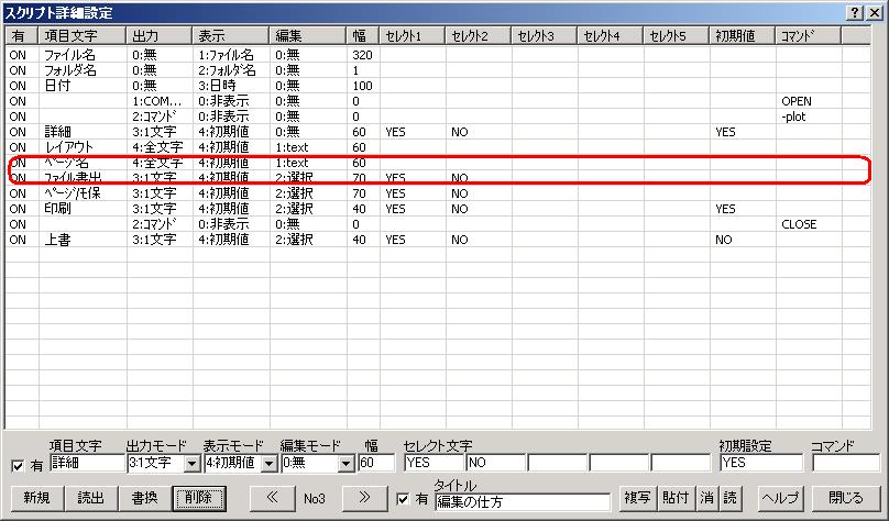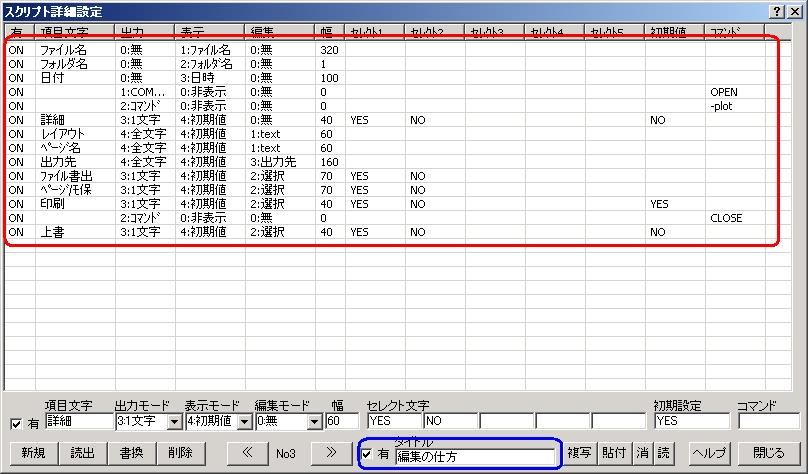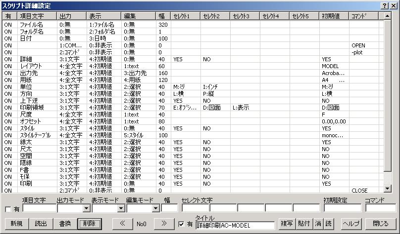 | スクリプトの設定は最大20ページ設定出来ます。 1ページで50個のコマンド類が設定出来ます。 「≪」と「≫」をクリックするとページが切り替わります。 「≪」と「≫」の間のNo.表示はページ番号の表示です。 0〜19まで可変します。 「≫」の横の「有」チェックBOXはこのページを有効にするという意味です。 リストビューに設定してもこの「有」チェックBOXがOFFなら未登録になります。 必ず設定したら「有」チェックBOXをONして下さい その横のEditBoxはページのタイトル名です。 その横の「複写」・「貼付」・「消」はぺージ単位で実行します。 「読」のボタンは外部ファイルからリストビューに取り込む処理です。 コマンド類の項目の編集 1・新規作成 「有」チェックBOX・項目文字・出力モード・表示モード・編集モード・幅・ セレクト文字・初期設定・コマンドを設定して「新規」のボタンを押すと リストビューに追加します。 2・読出 選んだリストビューの内容を「有」チェックBOX・項目文字・出力モード・ 表示モード・編集モード・幅・セレクト文字・初期設定・コマンドに 読み出します。 リストビューの内容を変更するのに使います。 3・書込 「有」チェックBOX・項目文字・出力モード・表示モード・編集モード・幅・ セレクト文字・初期設定・コマンドを設定して「書込」のボタンを押すと 選んだリストビューに書き換えます。 読出とセットで使うとリストビューの内容を変更出来ます。 4・削除 選んだリストビューの内容を削除するとき「削除」ボタンを押します。 5・「有」チェックBOX これは、項目文字・出力モード・表示モード・編集モード・幅・セレクト文字・ 初期設定・コマンドを有効にするボタンです。 このチェックBOXがOFF場合は、それ以降の内容は無効となります。 6・項目文字 項目文字は、リストビューのカラムの文字です。 7・出力モード 出力モードは、無・コマンド+パス名・コマンド・1文字・全文字を設定します。 スクリプトファイルに出力する設定です。 コマンド+パス名はOPENなどコマンドに使います。 コマンドは、CLOSEやPLOTなどに使います。 1文字は、YやNなどの先頭文字を出力します。 全文字は、スタイル名などで全文字を出力する 8・表示モード 表示モードは、無・ファイル名・フォルダ名・日時・初期値を設定します。 ファイル読込時、リストビューに表示る設定です。 ファイル名はファイル読込時のファイル名です。 フォルダ名はファイル読込時のフォルダ名です。 日時はファイル読込時の更新日時です。 初期値はファイル読込時の初期値を表示します。 9・編集モード 編集モードは、無・Text・選択・出力先・用紙・スタイルを設定します。 リストビューの内容を編集するときのモードです。 Textは、EditBoxでテキストで編集出来ます。 選択は、ComboBoxでセレクト文字の中から選びます。 出力先は、プリンター名を選びます。 用紙は、プリンターの用紙名を選びます。 スタイルは、スタイルテーブルのスタイル名を選びます。 10・幅 カラムの幅を設定します。 11・セレクト1〜5 編集時、ComboBoxに入れる文字です。 12・初期値 表示モードで初期値時、ファイル読込時のセットする文字です。 初期値を何も入れない方法も可能です。 スクリプトの中にはそのままリターンさせたいときは、 初期値なしにすれば良いです 12・コマンド 出力モードでコマンド+パス名又はコマンド時、 ファイル読込時のセットする文字(コマンド)です。 |