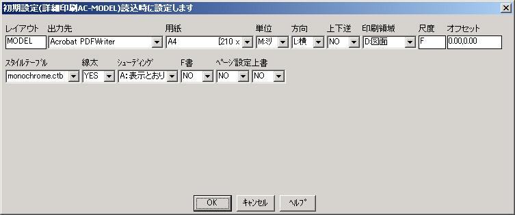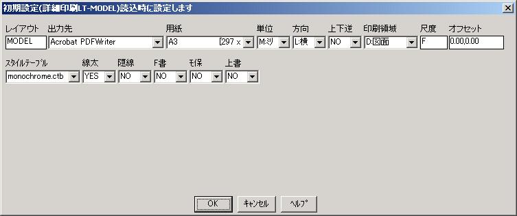 | 1・レイアウト名 レイアウト名を入力でModelとします。 2・出力先 出力デバイス名を入力で、OSが認識したプリンタを選択出来ます。 OSが認識したプリンタとは、WindowsXPの「スタート」・「設定」・「プリンタとFAX」をクリックした画面に 表示してあるプリンタの事です。 ここに表示していないプリンタは使用出来ません。3・用紙 設定したプリンタで使用できる用紙サイズを選択出来るようにしています。 3・用紙 用紙サイズを入力で、OSが認識したプリンタの用紙サイズを選択出来ます。 OSが認識したプリンタとは、WindowsXPの「スタート」・「設定」・「プリンタとFAX」をクリックした画面に 表示してあるプリンタの用紙種類の事です。 ここに表示していないプリンタの用紙種類は使用出来ません。 4・単位 用紙単位でAutoCADと同じ意味です。 「M:ミリ」・「I:インチ」を設定します。 5・方向 印刷する方向AutoCADと同じ意味です。 「L:横」・「P:縦」を設定します。 6・上下逆 上下と逆にして印刷AutoCADと同じ意味です。 「YES」・「NO」を設定します。 7・印刷領域 印刷領域でAutoCADと同じ意味です。 「E:オブジェクト」・「D:図面」・「L:表示」を設定します。 ビュー・窓は非対応です。 8・印刷尺度 印刷尺度でAutoCADと同じ意味です。 「F」又は「数値」を設定します。 Fとはフィットと言う意味です。 9・オフセット 印刷オフセットでAutoCADと同じ意味です。 「C」又は「数値」を設定します。 「C」とはセンターと言うことです。 10・スタイルテーブル 印刷デバイスの印刷スタイルテーブルでAutoCADと同じ意味です。 これは、AutoCADのデレクトリ内にあるスタイルテーブルを探してそのスタイルテーブルを 表示させ、選択出来ます。 AutoCADのデレクトリ内にスタイルテーブルが無ければ、コンボBOXに表示しません。 11・線太 線の太さを使用して印刷するか、でAutoCADと同じ意味です。 「YES」・「NO」を設定します。 12・シューデング 印刷オプションのシューデング印刷の設定でAutoCADと同じ意味です。 「A:表示通り」・「H:隠線処理」・「W:ワイヤフレーム(W)」・「R:レンタリング」・「V:表示スタイル」を設定します。 13・F書 印刷をファイルへ書き出しますか、でAutoCADと同じ意味です。 「YES」・「NO」を設定します。 14・ページ設定 ページ設定の変更しますか、でAutoCADと同じ意味です。 「YES」・「NO」を設定します。 15・上書 図面を閉じる時に上書き保存するか、でAutoCADと同じ意味です。 「YES」・「NO」を設定します。 |