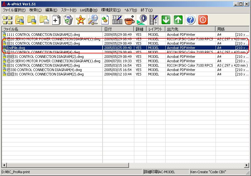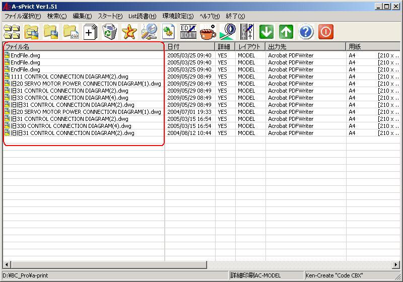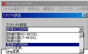 Ver1.50 1・印刷専用からスクリプト全般に作成しました。 ソフト名を「A-sPrict」に改名した。 Ver1.51 1・リストビューの編集のコピペの動作を修正 2・ステータスバーの改善 3・初期設定のタイトルバーの改善 4・詳細印刷AC-MODELの設定内容を修正 Ver1.52 1・ファイルのパス名を256→260(MAX)にした。 Ver1.53 1・sprct_set2.iniを修正OPENとCLOSEを小文字にした。 Ver1.54 1・マーク検出時ShiftJISの改善 2・ヘルプの表示方法変更 Ver1.55 1・連続修復するため、1行毎のスクリプトにAUTOCADを起動するタイプを追加した。 2・スクリプト編集で、項目上下機能、ファイル保存読出機能を追加した。 3・リストビューの再構築で、コラムを全部消してから再構築した。 |