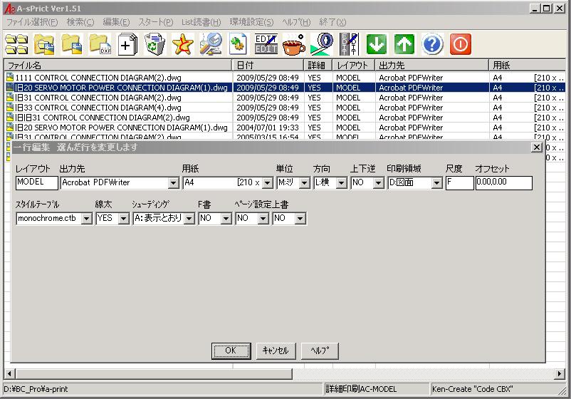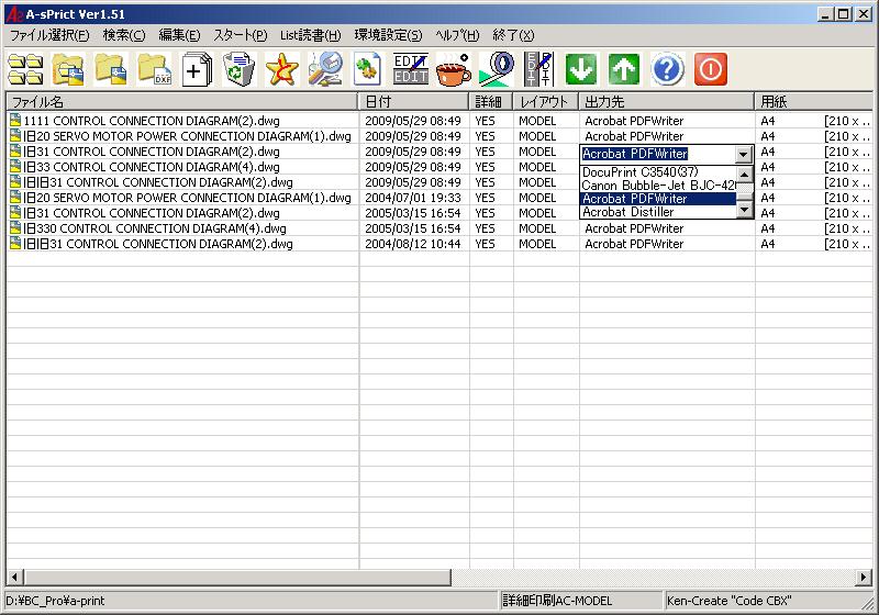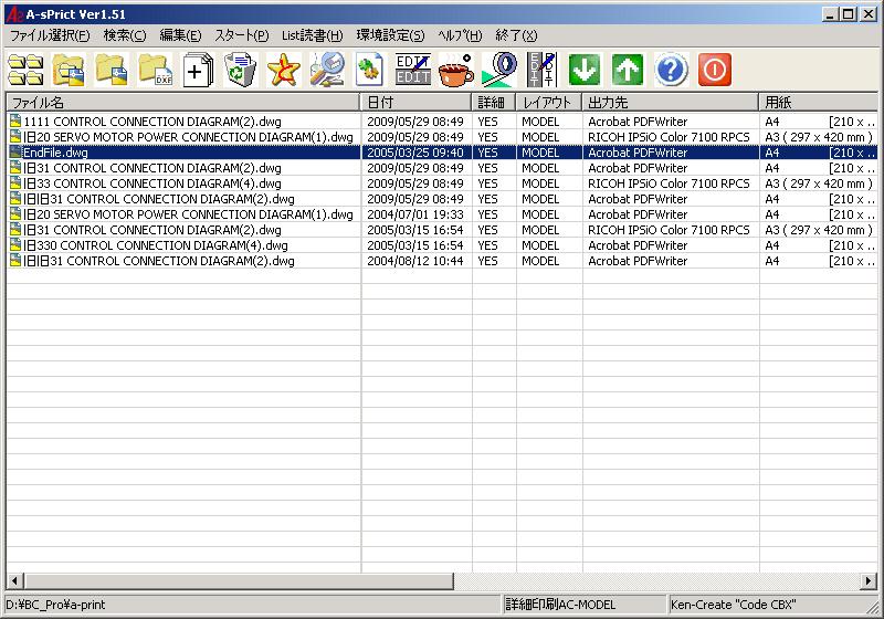 | AutoCad LT又はAutoCadで連続スプリクト処理するツールです。 具体的には、自分でスクリプトを作って連続自動処理をするツールです。 必要なファイルはAutocad又はAutocad LTです。 とりあえずは、連続印刷とDXF/DWG変換機能を登録する予定です。 連続印刷は、付属済み このソフトは出世しました。 Atc−Print Ver1.00〜1.18a 初回リリース品でリスト表示でした。 Ver1.00は2時間の特急で作りました。 せっぱ詰まっていたので・・・・・。 A−Print Ver1.20〜1.34 リストBOXからリストビューへ変更し、 印刷設定を4種類持つようにした。 しかもスクリプトを作成する機能が付いていて 連続印刷以外の処理も連続で出来ました。 A++Print Ver140〜1.47b 次にさらに進化した物を作ったつもりでしたが、 連続印刷のみになってどちらかと言うとレベルダウン! 名前だけのソフトになってしまいました。 A-sPrict Ver150〜 このバージョンでやっと思っていたソフトが完成しました。 A-Printをさらに良くした感じです。 スクリプト中心で作成され連続印刷ソフトと言うよりも 連続スクリプト処理をするソフトです。 まーいずれにしても、バージョンによって名前が変わっています。 名前について「sPrict」ってスクリプト? それにしてもつづりが違います。 これは、スクリプトとプリントを加算して2で割ったという文字にしました。 |
