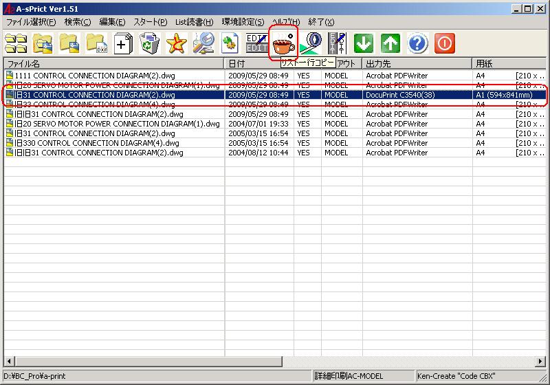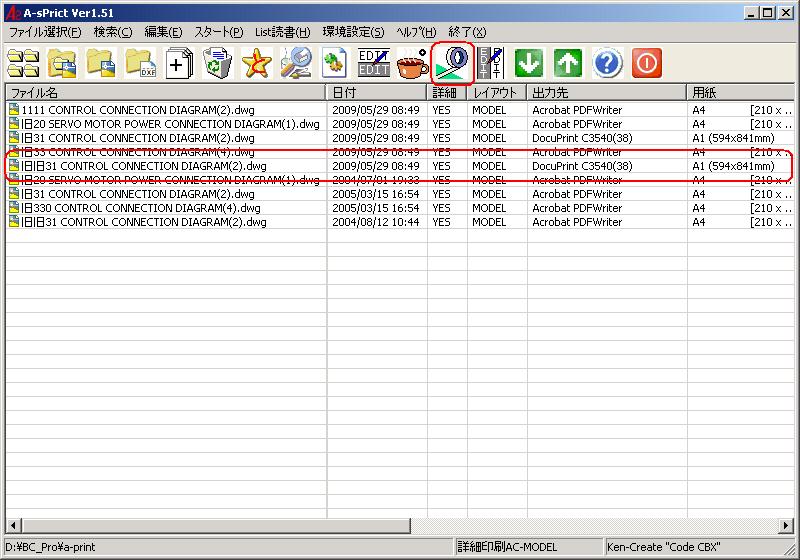 メニューの「検索」「リスト内検索」を クリック出てきたEditBoxに図面ファイル名を 入力検索ボタンを押す。 |