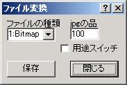 | 現在表示中の画像を別形式でファイルに変換します。 別形式とは、Bitmap・JPEG・GIF・PNGです。 大きさと回転も表示した形式で保存します。 ファイルの種類 ここで選んだ形式にファイル保存します。 形式とは、Bitmap・JPEG・GIF・PNGです。 JPEGで保存した場合、クオリティ(品質)を設定します。 1〜100の範囲で値が小さいと画質が低下しますが ファイルサイズが小さく出来ます。 値が大きいと画質が維持されるが、 ファイルサイズは大きくなります。 (JPEG以外はこの値は無関係です) 用途スイッチは形式によって異なります。 BMP=無関係 JPEG=プログレッシブのスイッチで、ON=プログレッシブJPEG GIF=インターレースのスイッチで、ON=インターレースGIF PNG=インターレースのスイッチで、ON=インターレースPNG |