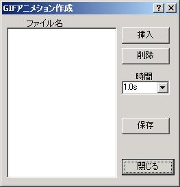 | 簡単な操作方法 @画像のファイル名を指定する。 A表示の切り替える時間を設定する BGIFアニメ形式に保存する 画像ファイル名を指定する 「挿入」のボタンを押すとファイルを選ぶ事が出来ます。 選ばれたファイルは、ファイル名のリストボックスに表示します。 リストボックスの上から順番でアニメの表示する順番です。 選ぶファイルの形式は、Bitmap・JPEG・GIF・PNGです。 ファイルは最大100個まで指定出来ます。 「挿入」のボタンを押してファイルを選ぶ時、複数選択出来ます。 リストボックス内のファイル名をすべて消す場合は、「削除」のボタンを押します。 時間の設定 時間のコンボボックスで設定します。 0.1・0.2・0.3・0.4・0.5・0.7・1.0・1.2・1.5 2.0・2.5・3.0・4.0・5.0秒を設定出来ます。 GIFアニメーションに保存 「保存」のボタンを押すこと、保存するファイル名を指定します。 指定後、保存します。 |