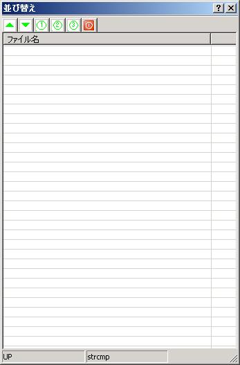 上記画面に読み込んだファイル名がリスト表示します。 それのカラムをクリックするとファイル名のソートが可能です。 @・A・Bをクリックするとソートの種類が変わります。 手動でソートする場合は、項目を選択して「△・▽」をクリックすると 1個づつ項目を上下して並び替えが可能です。 ステータスバーにはUPかDOWNを表示とソートの種類を表示します。 ソートの種類 strcmp=一つの文字列として大小比較します。 文数順=文字と数字を分けて大小比較します。 文一致数=文字と数字を分けて先に文字を大小比較した後、 数字を大小比較します。 表示させる画面が固定でしたが、 これで表示させる順番が好きな順番で表示可能になりました。 |
