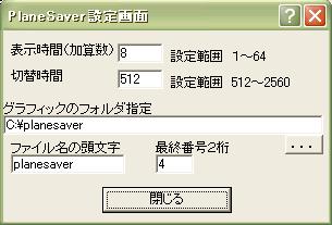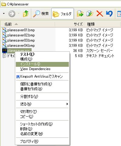 | まずは「PlaneSaver.lzh」を解凍して下さい。 すると「PlaneSaver.exe」が出来ます。 「PlaneSaver.exe」を実行して下さい。 「PlaneSaver.exe」はLZHの自己解凍型です。 解凍先はC:\planesaverにして下さい。 解凍先をC:\planesaver以外にする場合は、設定が必要です。 設定でファイル読込先を任意に設定して下さい。 解凍したファイルの「PlaneSaver.scr」を右クリックして、 インストールを実行して下さい。 |