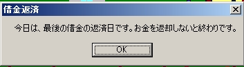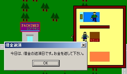 | 1・コメントのメッセージは、Enter_キーで非表示する。 2・店や家に入ったら、下側のマットに行けば、出られる。 3・手持ちのお金がなくなったら消費者金融でお金が借りられるが、利息は高い 4・借金地獄にはまると人生には3つの道がある。その一つはゲームは終了する。 5・ホテルで寝ると1日経過するよ、部屋の隅にいると時間経過が速くなるよ。 6・パチンコ店は朝10時から夜23時まで営業している。 7・23時以降にパチンコしていると強制的に終わる。注意が必要。 8・酒屋での情報は役立つ話が多い。 ここでは特に攻略するヒントはない。 どちらかというと、使い方についての話題になっている。 |