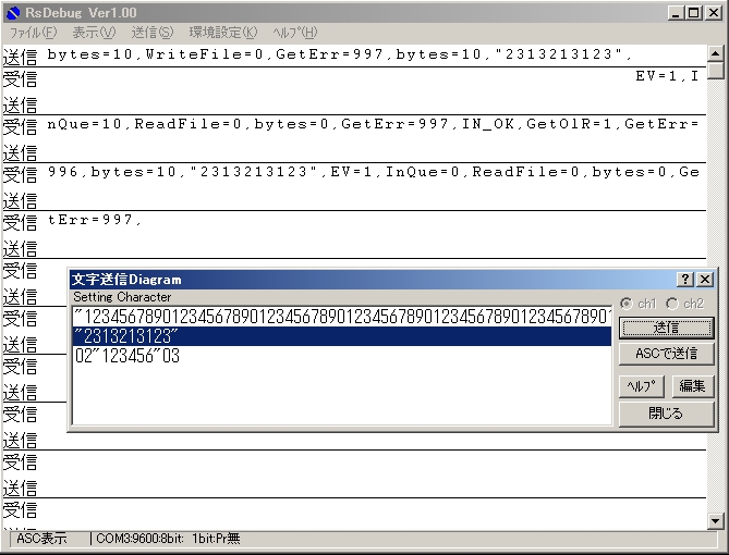 上図のように、受信した内容と送信した内容が表示します。 送信も出来ます。 操作方法は「シリアルはWinで行こう」と同じです。 <受信時> 受信すると以下のように表示します。 1・イベントの発生(WaitCommEvent)で「EV=1,」と表示します。 1=受信文字がバッファに入った時 2・受信バッファに入った文字数で「InQue=8,」と表示します。 3・API関数ReadFileの戻り値で「ReadFile=0,」と表示します。 4・API関数ReadFileで読んだ文字数で「bytes=8,」と表示します。 5・API関数ReadFileを実行時のGetLastError値で「GetErr =997,」と表示します。 6・API関数GetOverlappedResultを実行時の処理で「IN_OK,」と表示すれば、正常終了です。 「TimUP,」と表示すれば、正常になるまで待ち続けたがタイムUPで抜けた状態です。 7・API関数GetOverlappedResultの戻り値で「GetOlR=0,」と表示します。 8・API関数GetOverlappedResultを実行時のGetLastError値で「GetErr =996,」と表示。 9・API関数GetOverlappedResultで読んだ文字数で「bytes=8,」と表示します。 10・受信した文字を「”1234567”,」と表示します。 <送信時> 送信すると以下のように表示します。 1・送信文字数で「bytes=8,」と表示します。 2・API関数WriteFileの戻り値で「WriteFile=0,」と表示します。 3・API関数WriteFileで戻り値が0の場合のGetLastError値で「GetErr =997,」と表示。 997= ERROR_IO_PENDINGです。 4・API関数GetOverlappedResultで送信した文字数で「bytes=8,」と表示します。 5・API関数WriteFileの戻り値が0で、かつ、GetLastError値がERROR_IO_PENDINGで無い時、 「Error,」と表示します。 |