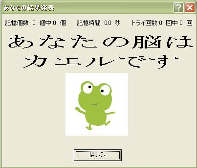 | <固定コースの場合> レベル1:カエル 0〜2の数値しか当てられない場合、カエルの脳です。 記憶時間やトライ回数は条件に無いです。 最低でもこの表示をします。 レベル2:鳥 3以上の数値を当てたら鳥の脳です。 記憶時間やトライ回数は条件に無いです。 レベル3:リス 記憶個数を5以上でトライ回数1回以上クリアしたらリスの脳です。 記憶時間は条件に無いです。 レベル4:いのしし 記憶個数を7以上でトライ回数1回以上クリアしたらいのししの脳です。 記憶時間は条件に無いです。 レベル5:うさぎ 記憶個数を7以上で記憶時間が2.0以内でトライ回数1回以上クリアしたらいのウサギの脳です。 記憶時間は条件に無いです。 レベル6:ブタ 記憶個数を7以上で記憶時間が1.5以内でトライ回数1回以上クリアしたらいのブタの脳です。 記憶時間は条件に無いです。 レベル7:犬 記憶個数を7以上で記憶時間が1.0以内でトライ回数2回以上クリアしたらいの犬の脳です。 記憶時間は条件に無いです。 レベル8:人間 記憶個数を7以上で記憶時間が0.8以内でトライ回数3回以上クリアしたらいの人間の脳です。 記憶時間は条件に無いです。 レベル9:チンパンジー 記憶個数を7以上で記憶時間を0.4以内 トライ回数3回以上クリアしたらいのチンパンジーの脳です。 レベル10:チンパンジーを追えた超天才(人間) 記憶個数を9以上で記憶時間を0.5以内 トライ回数3回以上クリアしたらいの超天才の脳です。 <チャレンジコースの場合> チャレンジ1(記憶個数5:記憶時間3.0) ここで失敗するとカエルの脳です。 チャレンジ2(記憶個数5:記憶時間2.0) ここで失敗すると鳥の脳です。 チャレンジ3(記憶個数5:記憶時間1.5) ここで失敗するとリスの脳です。 チャレンジ4(記憶個数5:記憶時間1.0) ここで失敗するとイノシシの脳です。 チャレンジ5(記憶個数5:記憶時間0.7) ここで失敗するとウサギの脳です。 チャレンジ6(記憶個数5:記憶時間0.5) ここで失敗するとブタの脳です。 チャレンジ7(記憶個数7:記憶時間3.0) ここで失敗すると鳥の脳です。 チャレンジ8(記憶個数7:記憶時間2.0) ここで失敗するとリスの脳です。 チャレンジ9(記憶個数7:記憶時間1.5) ここで失敗するとイノシシの脳です。 チャレンジ10(記憶個数7:記憶時間1.2) ここで失敗するとウサギの脳です。 チャレンジ11(記憶個数7:記憶時間1.0) ここで失敗するとブタの脳です。 チャレンジ12(記憶個数7:記憶時間0.8) ここで失敗すると犬の脳です。 チャレンジ13(記憶個数7:記憶時間0.6) ここで失敗すると人間の脳です。 チャレンジ14(記憶個数7:記憶時間0.5) ここで失敗すると人間の脳です。 チャレンジ15(記憶個数7:記憶時間0.4) ここで失敗すると人間の脳です。 チャレンジ16(記憶個数7:記憶時間0.3) ここで失敗するとチンパンジーの脳です。 チャレンジ17(記憶個数7:記憶時間0.2) ここで失敗するとチンパンジーの脳です。 チャレンジ18(記憶個数9:記憶時間3.0) ここで失敗すると犬の脳です。 チャレンジ19(記憶個数9:記憶時間2.0) ここで失敗すると犬の脳です。 チャレンジ20(記憶個数9:記憶時間1.5) ここで失敗すると犬の脳です。 チャレンジ21(記憶個数9:記憶時間1.2) ここで失敗すると人間の脳です。 チャレンジ22(記憶個数9:記憶時間1.0) ここで失敗すると人間の脳です。 チャレンジ23(記憶個数9:記憶時間0.8) ここで失敗すると人間の脳です。 チャレンジ24(記憶個数9:記憶時間0.6) ここで失敗するとチンパンジーの脳です。 チャレンジ25(記憶個数9:記憶時間0.5) ここで失敗するとチンパンジーの脳です。 チャレンジ26(記憶個数9:記憶時間0.4) ここで失敗するとチンパンジーの脳です。 チャレンジ27(記憶個数9:記憶時間0.3) ここで失敗すると天才の脳です。 チャレンジ28(記憶個数:記憶時間0.2) ここで失敗すると天才の脳です。 |