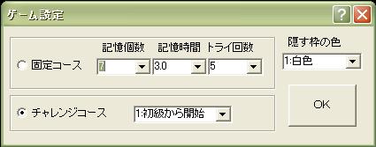 | 固定コースとチャレンジコースを選定します。 固定コースとは、記憶個数・記憶時間・トライ回数を設定してゲーム開始 この設定でゲームを進めます。 チャレンジコースとは、記憶個数・記憶時間があらかじめ設定してあり 段々難しくなっていくゲームの進め方です。 つまり、はじめは優しく、段々難しくなっていくようになっています。 <固定コースの設定> 記憶個数は一度に記憶する数で1〜9設定します。 つまり、画面に表示する数字の個数です。 記憶時間は表示した数値を記憶するための時間です。 つまり、スタートすると数字が表示され、この時間を経過すると数字が隠される トライ回数とは、記憶テストの再トライの回数です。 つまり、記憶テストを数回実施します。 一度だけでは、まぐれもありますから。 <チャレンジコースの設定> チャレンジコースは初級(記憶個数5)で3.0秒からスタートして0.5秒まで進み 中級(記憶個数7)に移行して、3.0秒からスタートして0.2秒まで進み、 上級(記憶個数9)に移行して、3.0秒からスタートして0.2秒まで進みます。 初級は記憶個数5で中級は記憶個数7で上級は記憶個数9です。 初級・中級・上級と設定がありが、その級からスタート出来るという設定です。 よって、初級を飛ばして中級からスタートしたい場合、中級と設定します。 <その他の設定> 隠す枠の色は、数字を隠す時の四角の枠の色を設定します。 つまり、好みに合わせて色を決めて下さい。 私なら純白の白がいいな。 以上の設定は、終了時に"setdata.ini"に保存され、 再起動しても同じ設定になっています。 |