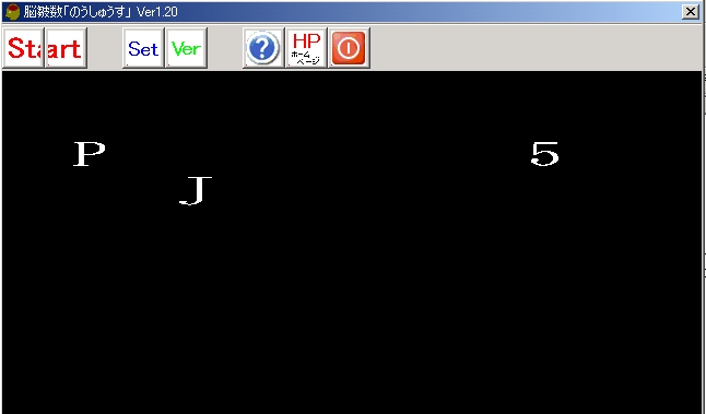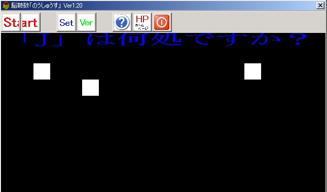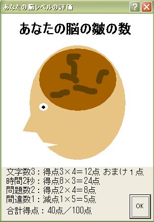 | 文字数について 文字数1個につき4点加算します。 文字数とは、一画面で何個の文字が出るか設定します。 表示時間について 1秒で27点、2秒で24点、3秒で21点・・・・・・・9秒で3点加算します。 表示時間とは、文字が現れ■になるまでの時間で、つまり文字を記憶する時間です。 問題数について トライ回数のことで、1トライで4点加算します。 マウスでクリックして間違えると、1回に付き、5点減点します。 おまけが1点ついて、最大100点になります。 この点数によって、脳の皺(しわ)が数がS変化します。 |