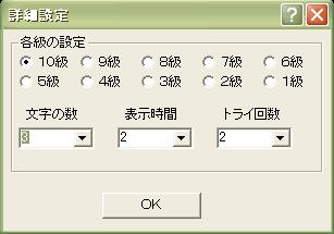 | ここでは1級〜10級を設定します。 ここの級とは、困難さを表します。 級の詳細については「詳細設定」を押します。 以上の設定は、終了時に"setdata.ini"に保存され、 再起動しても同じ設定になっています。 |
