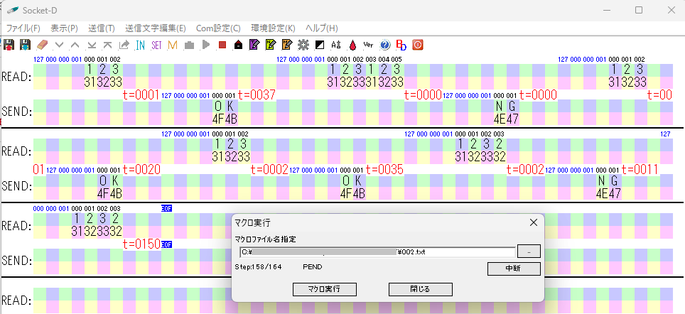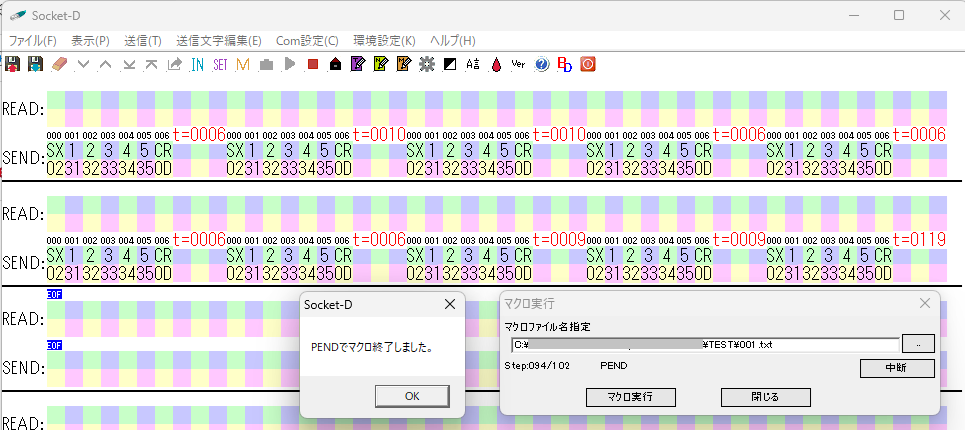 説明メモリ00に文字000を代入 :001 説明ラベル001 SEND "12345" 説明"12345"を送信 TIME 005 説明0.5秒待ち MINC 00 説明メモリ00を+1カウントUP CMPL 00 002 "010" 説明メモリ00と文字010と比較一致でラベル002へ飛ぶ GOTO 001 説明ラベル001へ飛ぶ :002 説明ラベル002 PEND 説明プログラム終了 |